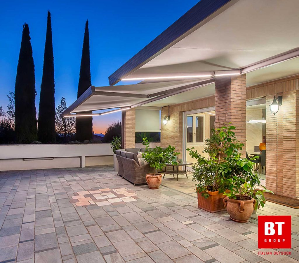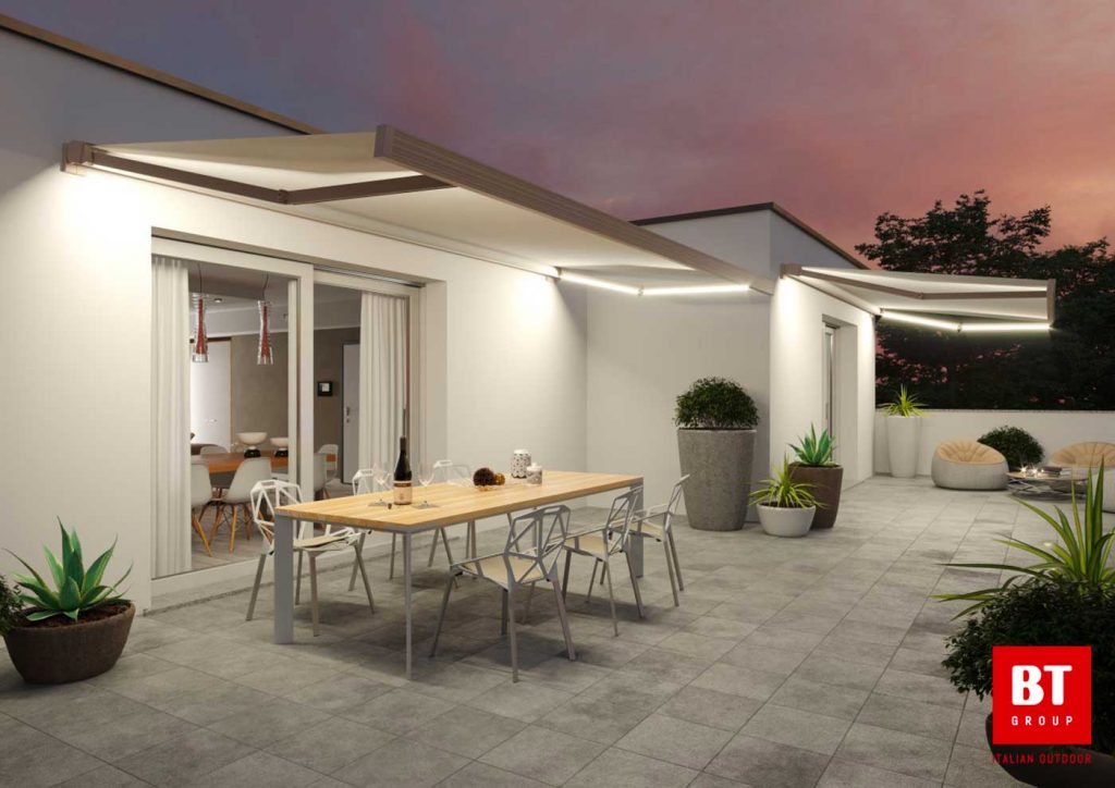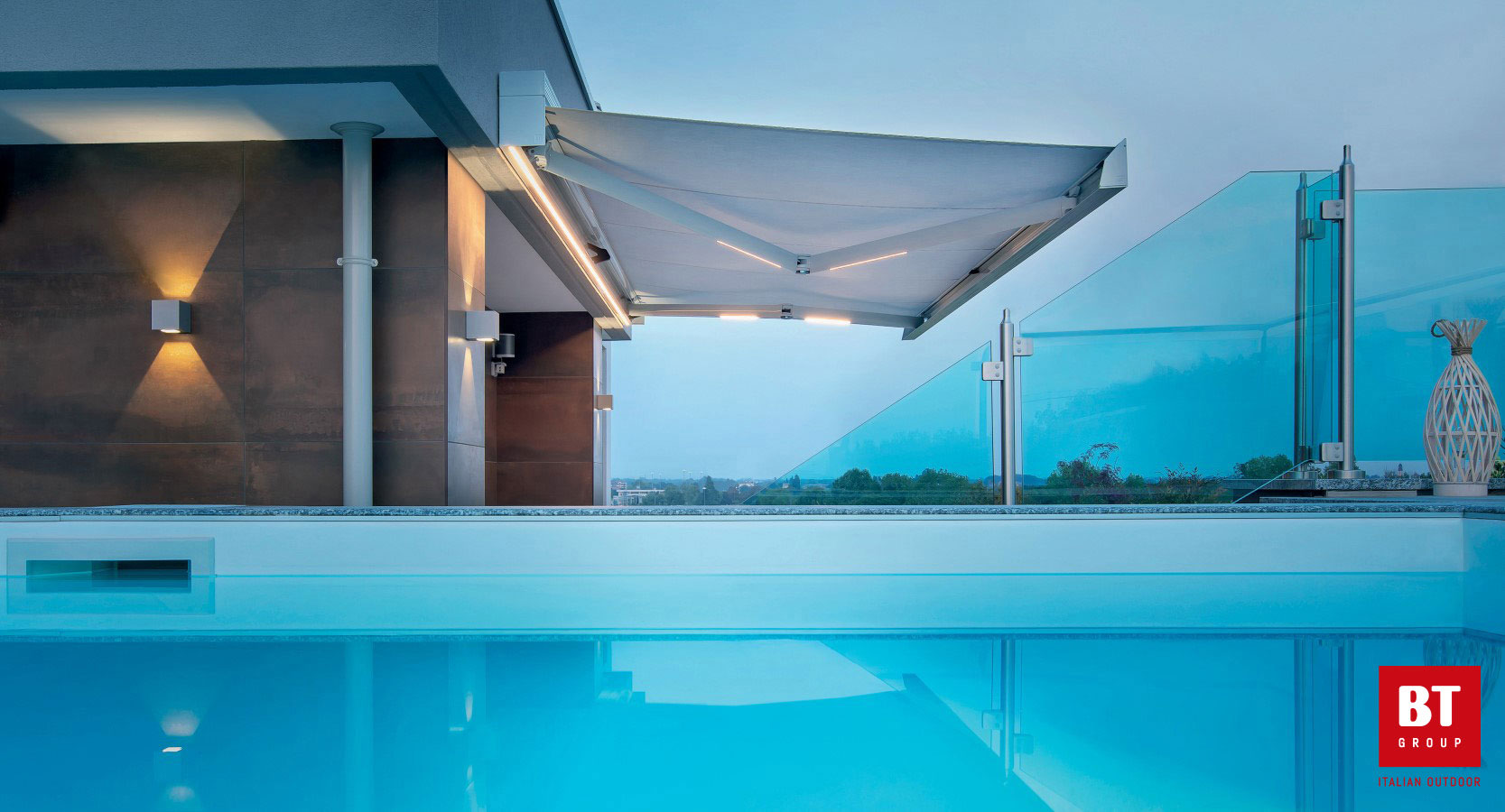 È inoltre possibile personalizzare la tenda con strip led incassati nel cassonetto e nei bracci.